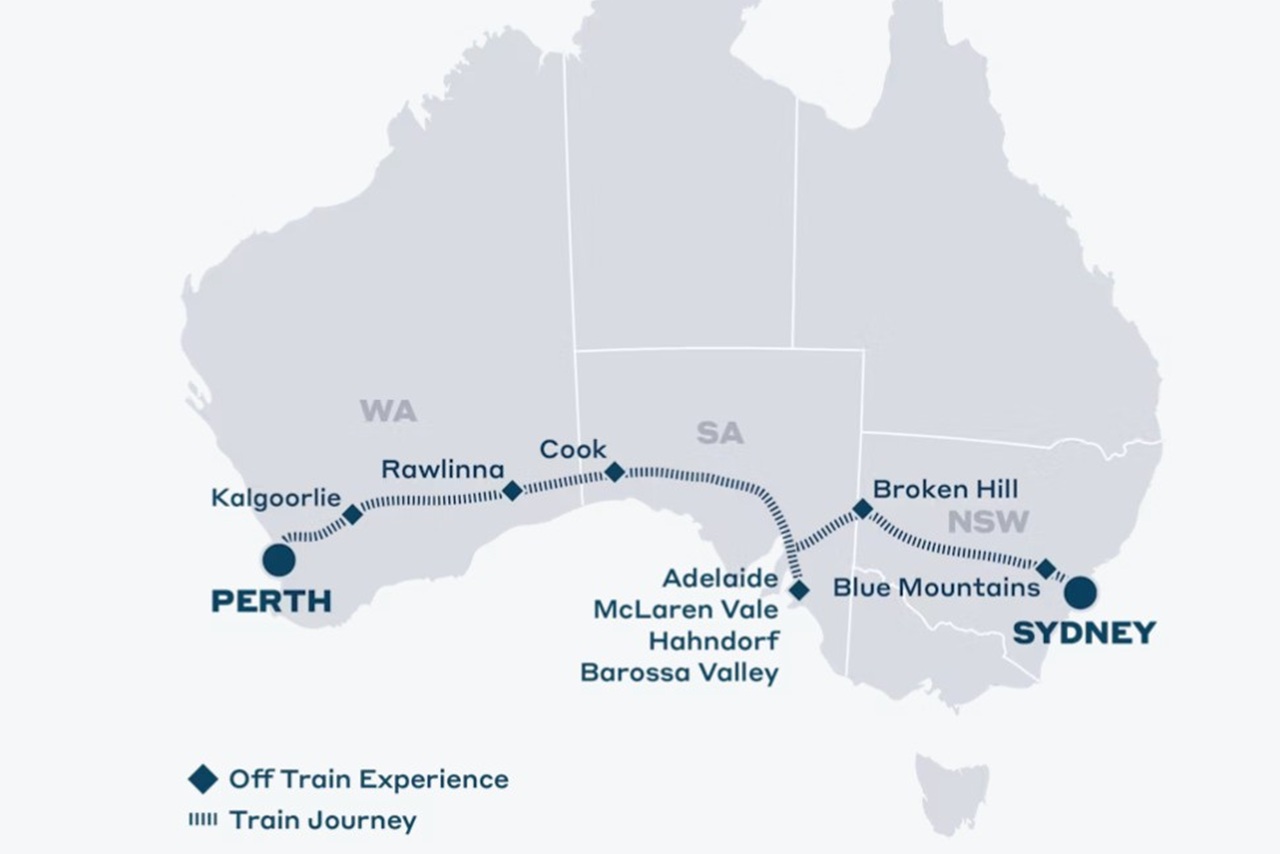 Tåget har fått sitt namn efter de två oceaner som markerar resans ändpunkter, och färdas mellan Perth, Adelaide och Sydney på en spektakulär sträcka om 4 352 kilometer.